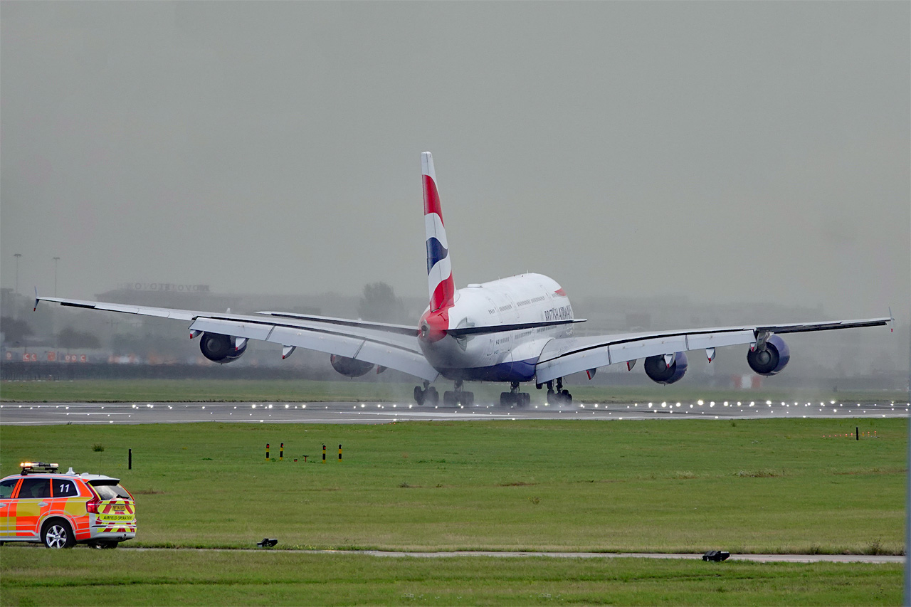 Im Regenguss die Landung des BA A380. Die störende Stahlhalterung der Schwebebahn (oberer Bildrand) habe ich mal "weggezaubert". ;-p