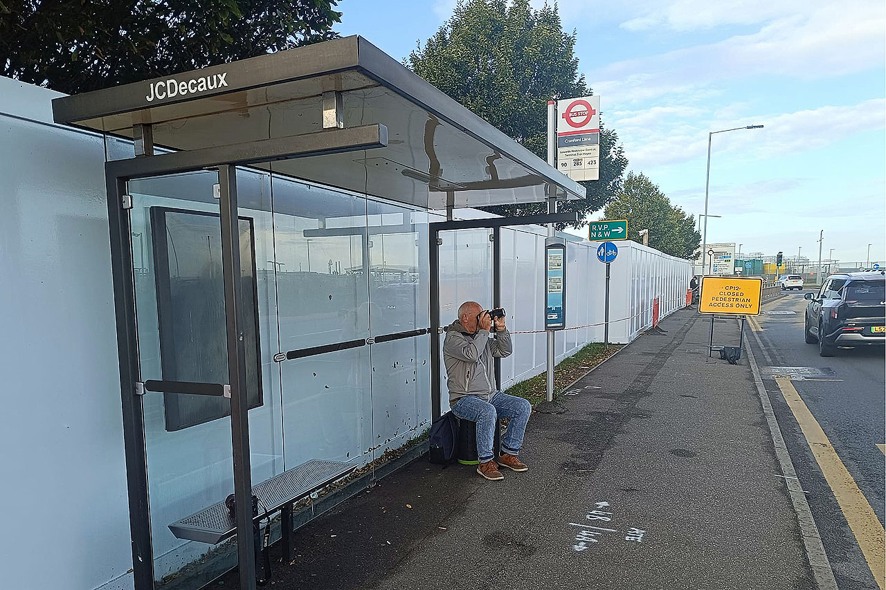 Wir stiegen am Kreisverkehr (Überflug Nordbahn) aus und gingen zur Haltestelle auf der anderen Seite (nahe Spotterpunkt 22), von wo aus wir gut fotografieren und uns hinsetzen konnten, bei einem möglichen Schauer auch einen Unterstand hatten.