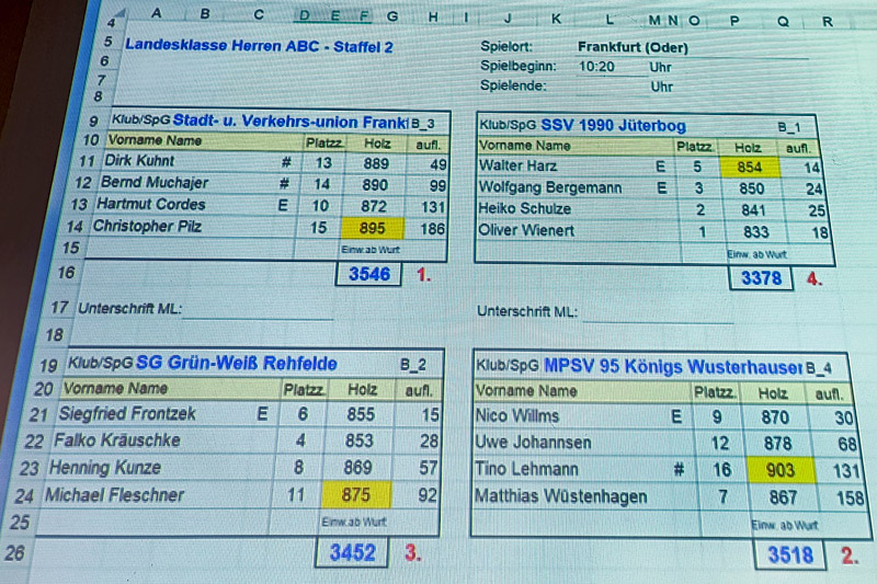 Die Gastgeber gewannen mit 3421 Gesamtholz vor Frankfurt/Oder (3396), die im Schlussdurchgang mit Chrsitopher Pilz (883) den Tagesbesten stellten. Jüterbog wurde mit 3366 Holz Letzter.