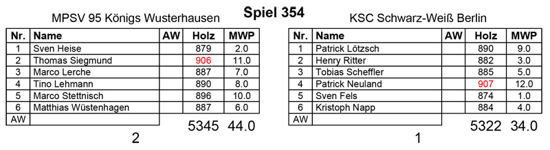 In Runde 4 gab es keine Besonderheiten, der Prignitzer Spieler schwächelte ein wenig, aber in darauffolgenden Durchgang haute Norbert Witzel mit dem Tagesbestwert von 930 Holz ein mächtiges Resultat heraus. Da konnte Matthias Wüstenhagen nicht mithalten, obwohl seine 899 Holz (noch im Endspurt erkämpft) auch in Ordnung waren.